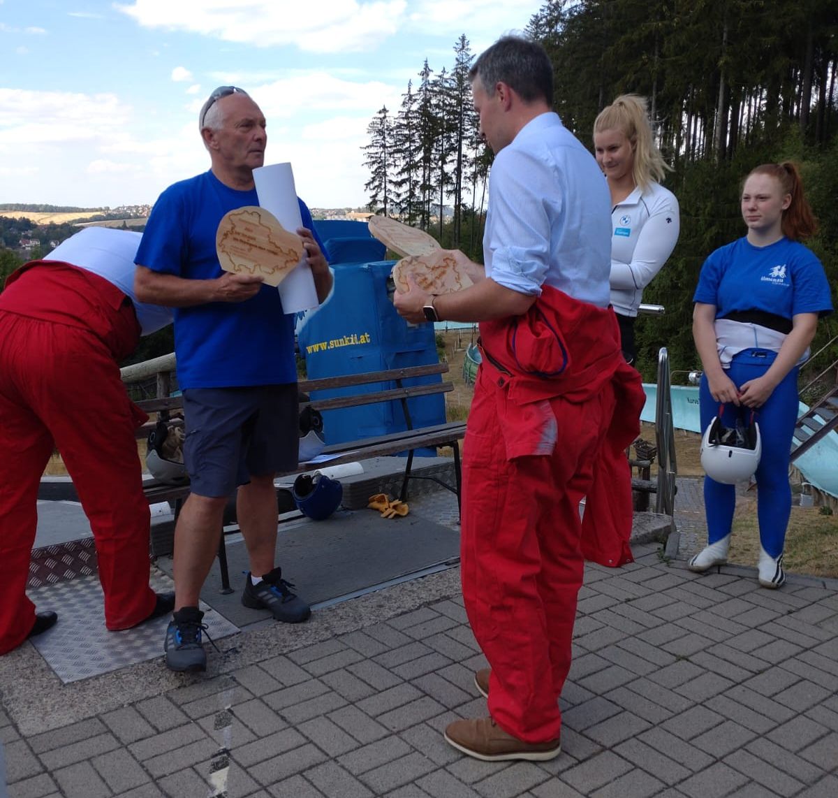 Unser Sportfreund Gerhard Kirchner, einer der geistigen Väter unserer Sommerrodelbahn, hat den Gästen zunächst die Sportanlage vorgestellt. Im Anschluss daran fand ein kleiner Rodelwettbewerb statt und mit den Teams Voigt und Bühl gab es hier 2 Sieger 🥇. Das Rodelteam „Voigt“ wurde hierbei auch von unseren Sportlerinnen Dajana Eitberger und Wenke Stief unterstützt, während zum Rodelteam „Bühl“ unserer Sportler Hans Rinn und die Sportlerin Elena Dyachenko gehörte.
